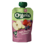 Een lekker 100% biologisch Organix fruithapje met appel, aardbei en bosbes in een handig knijpzakje. Het perfecte tussendoortje en ideale babyvoeding voor je baby of peuter!