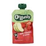Een lekker 100% biologisch Organix fruithapje met appel, aardbei en quinoa in een handig knijpzakje. Het perfecte tussendoortje en ideale fruithapje voor je peuter!