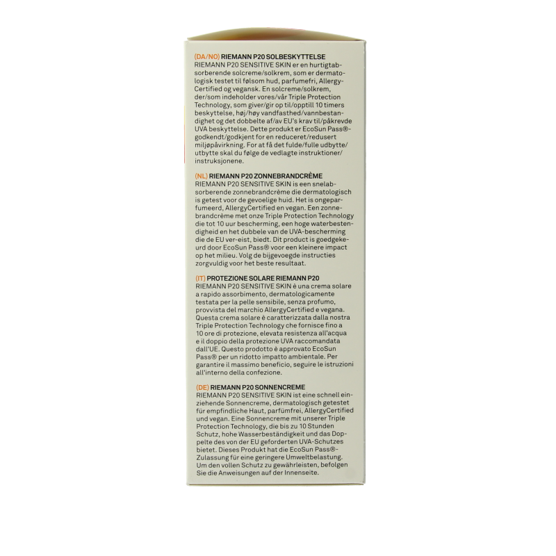Riemann P20 Sensitive Skin is een snelabsorberende zonnebrandcrème die dermatologisch is getest voor de gevoelige huid. Het is ongeparfumeerd, AllergyCertified en vegan.
