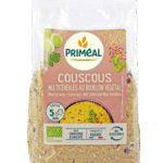 Meergranen couscous* (88%) (witte harde TARWEgriesmeel*, volwaardig griesmeel van harde TARWE*, kamut (GLUTEN) khorasan* (GLUTEN), speltTARWE, mais), azukibonenvlokken*, kasha* (geroosterde boekweit), plantaardige bouillon* (2,3%) ui*, koriander*, kurkuma*, SELDERIJ*, olijfolie*, wortels*, knoflook*, prei*, peper*, peterselie*), zeezout