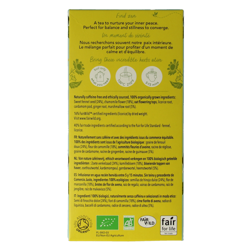 100% biologisch geteelde ingrediënten: zoete venkelzaad (24%), kamillebloem (18%), bloeiende toppen van HAVER, zoethoutwortel, kardemompeul, gemberwortel, heemstwortel (5%).