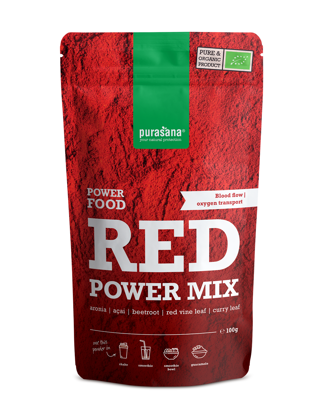 Purasana Red Power Mix is een superfood mix die bestaat uit poeders en extracten van rode biet, açai, aronia, rode wijnstokblad en kerrieblad. De rode superfoods in de Red Power Mix werken synergetisch samen. Ze beschermen de cellen tegen oxidatieve schade, met een indrukwekkende ORAC-score van 688. Rode wijnstokblad draagt bij aan een goede bloedcirculatie*, vooral in de microvaten en beenadere*n. IJzer in kerrieblad verhoogt de zuurstoftoevoer, wat essentieel is voor de energieproductie. De Red Power Mix is veelzijdig en ideaal voor atleten en mensen die regelmatig trainen.