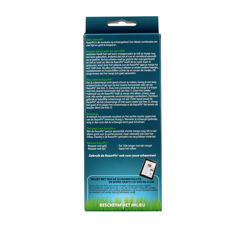 Iedereen heeft het wel eens meegemaakt: je wilt je mesje nog een keer gebruiken, ondanks dat het al ruw en vervelend aanvoelt op je gezicht. Na het scheren voelt je gezicht dan ook geirriteerd en ziet er rood uit. Met de Razorpit hoeft dit je nooit meer te gebeuren, want door het gebruik van de Razorpit gaat je mesje tot wel 150x langer mee. Na elke scheerbeurt blijven er onder andere haartjes, oxidatieresten en huidschilfers achter op en tussen de mesjes dit zorgt ervoor dat het mesje bot gaat aanvoelen.
