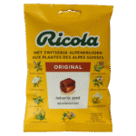 Suiker, glucosestroop, extract (1%) van Ricola 13 kruidenmix (weegbree, heemst, munt, tijm, salie, spitslobbige vrouwenmantel, vlier, sleutelbloem, gewoon duizendblad, kleine bevernel, ereprijs, kaasjeskruid en malrove), kleurstof (karamel), pepermuntolie, muntolie, menthol.