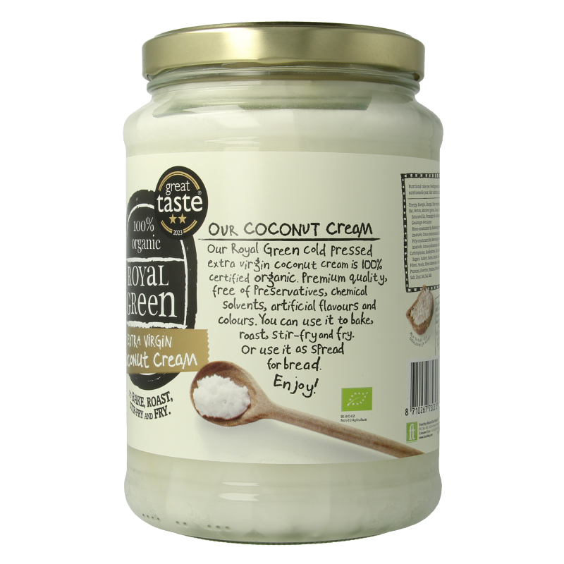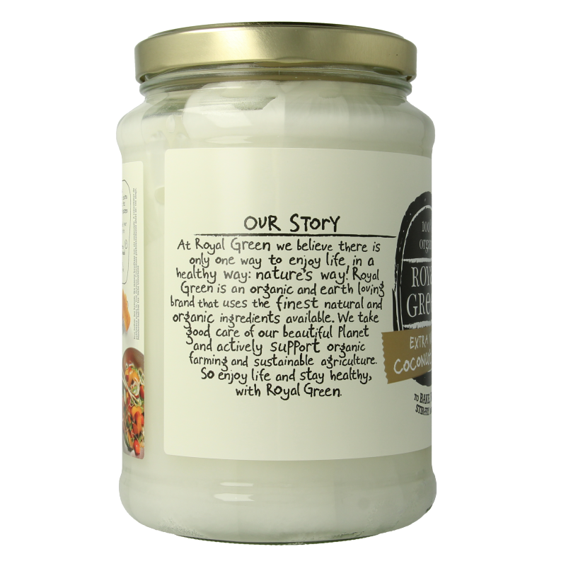 Bakken, braden, wokken en frituren is nog nooit zo gezond geweest. Ook te gebruiken ter vervanging van boter. De gecertificeerd biologische kokosolie van Royal Green is een zeer gezonde olie die al haar goede eigenschappen behoudt bij verhitting. Ideaal ter vervanging van onder andere olijfolie. Tijdens het braden, wokken, bakken of frituren is er geen vorming van schadelijke stoffen of vrije radicalen. Rijk aan laurinezuur, licht verteerbaar en zonder transvetzuren.