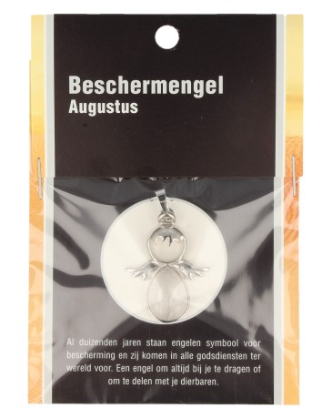Beschermengel augustus op kaartje, een zilverkleurig engeltje met een gekleurd parelmoer balletje.