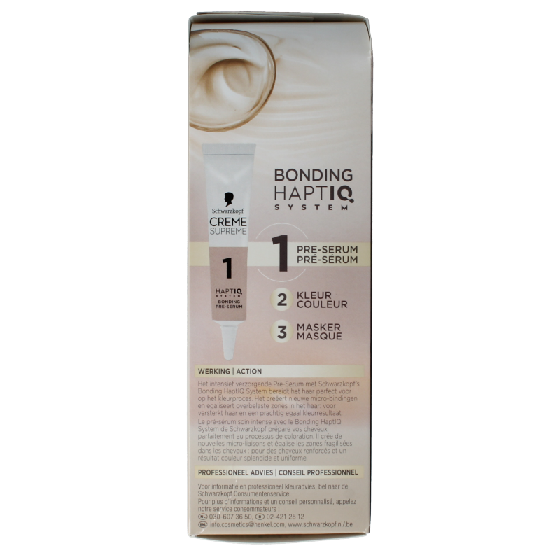 Het intensief verzorgende Pre-Serum met Schwarzkopf’s Bonding HaptiQ System bereidt het haar perfect voor op het kleurproces. Het creëert nieuwe micro-bindingen en egaliseert overbelaste zones in het haar: voor versterkt haar en een prachtig egaal kleurresultaat.