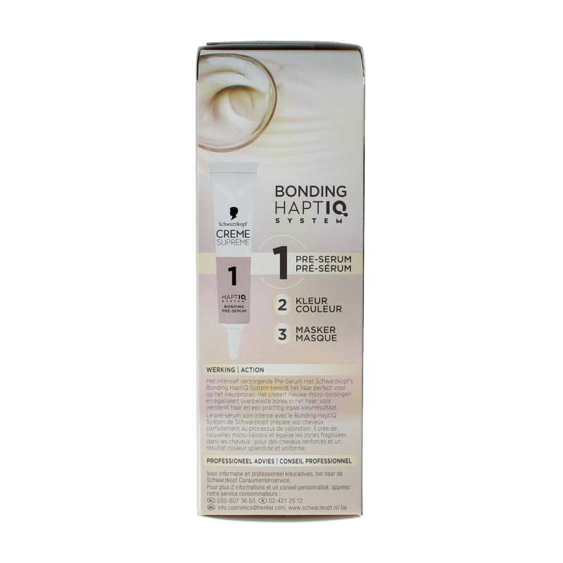 Het intensief verzorgende Pre-Serum met Schwarzkopf’s Bonding HaptiQ System bereidt het haar perfect voor op het kleurproces. Het creëert nieuwe micro-bindingen en egaliseert overbelaste zones in het haar: voor versterkt haar en een prachtig egaal kleurresultaat.