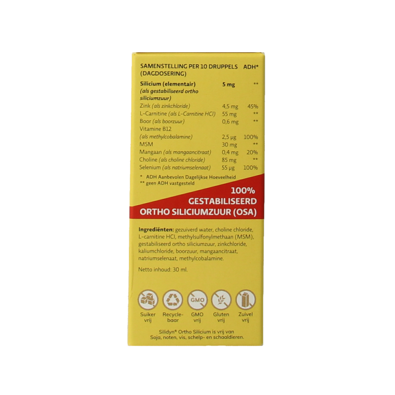 Het bevat naast Ortho Siliciumzuur (OSA) ook MSM, Borium, Mangaan en L-Carnitine. Daarnaast is het rijk aan Zink, Vitamine B12, Choline en Selenium.