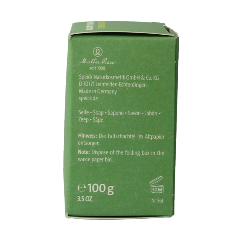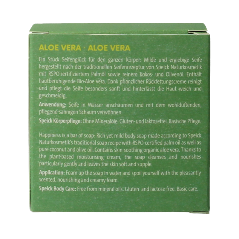 Happiness is een stuk zeep: Rijke maar milde lichaamszeep, gemaakt volgens het traditionele zeeprecept van Speick Naturkosmetik met RSPO-gecertificeerde palmolie, pure kokosolie en olijfolie. Bevat huidkalmerende biologische aloë vera. Dankzij de plantaardige hydraterende crème reinigt en verzorgt de zeep bijzonder zacht en laat de huid zacht en soepel aanvoelen. Verpakking: FSC-gecertificeerde vouwdoos van papier. Voor optimaal recyclen, gooi de vouwdoos bij het oud papier.