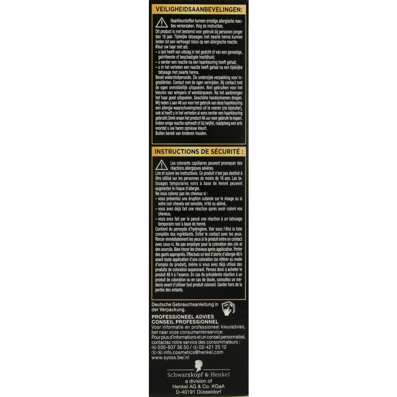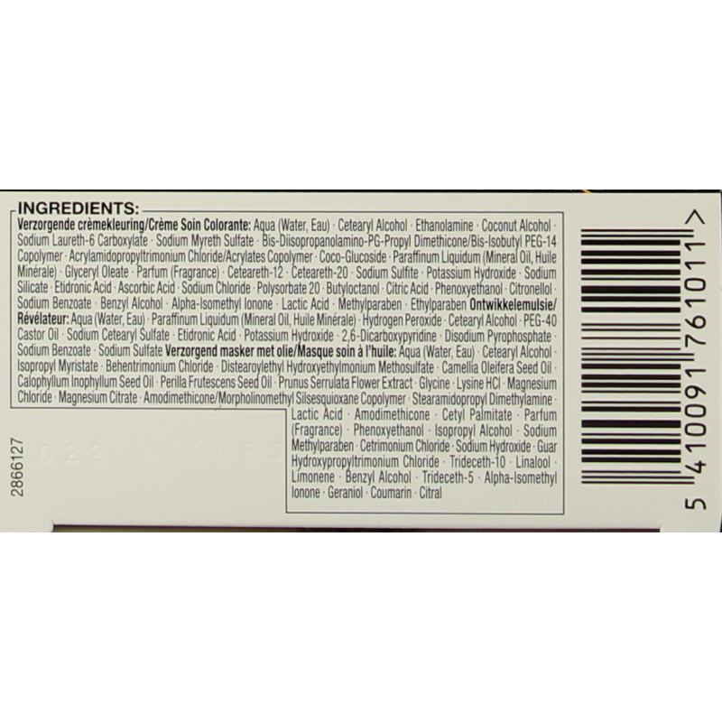 Bevat waterstofperoxide, fenyleendiaminen (tolueen-diaminen) en resorcinol. Contact met de ogen vermijden. Bij contact met de ogen onmiddellijk uitspoelen. Niet gebruiken voor het kleuren van wimpers of wenkbrauwen. Na het aanbrengen het haar goed uitspoelen. Geschikte handschoenen dragen.