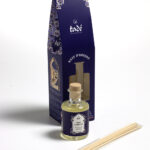 Inhoud van de doos: 1 glazen parfumflesje van 100ml + 5 rotanstokjes.