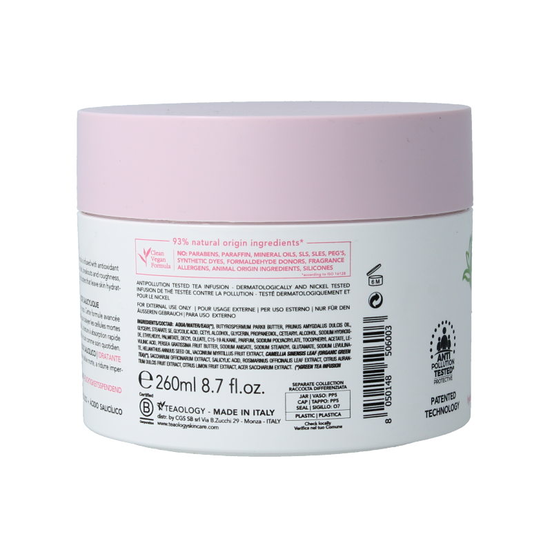 Aqua/Water/Eau(*), Butyrospermum Parkii Butter, Prunus Amygdalus Dulcis Oil, Glyceryl Stearate SE, Glycolic Acid, Cetyl Alcohol, Glycerin, Propanediol, Cetearyl Alcohol, Sodium Hydroxide, Ethylhexyl Palmitate, Decyl Oleate, C15-19 Alkane, Parfum, Sodium Polyacrylate, Tocopheryl Acetate, Levulinic Acid, Persea Gratissima Fruit Butter, Sodium Anisate, Sodium Stearoyl Glutamate, Sodium Levulinate, Helianthus Annuus Seed Oil, Vaccinium Myrtillus Fruit Extract, Camellia Sinensis Leaf (Organic Green Tea)(*), Saccharum Officinarum Extract, Salicylic Acid, Rosmarinus Officinalis Leaf Extract, Citrus Aurantium Dulcis Fruit Extract, Citrus Limon Fruit Extract, Acer Saccharum Extract. (*)Green Tea Infusion.