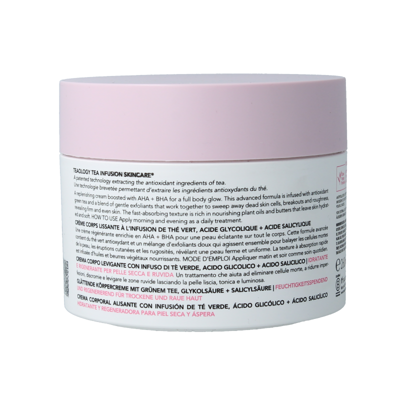Op zoek naar de ideale body cream voor een zachte en verzorgde huid? De Green Tea Glycolic Body Cream van Teaology is speciaal ontworpen voor de droge en ruwe huid. Ons lichaam verdient dezelfde gezonde glow als ons gezicht, vind je niet? De body cream is versterkt met AHA + BHA voor een full body glow. De body cream heeft een snel absorberende formule met een delicate geur waardoor je verzorging en geurintensiteit samen kunt voegen.
