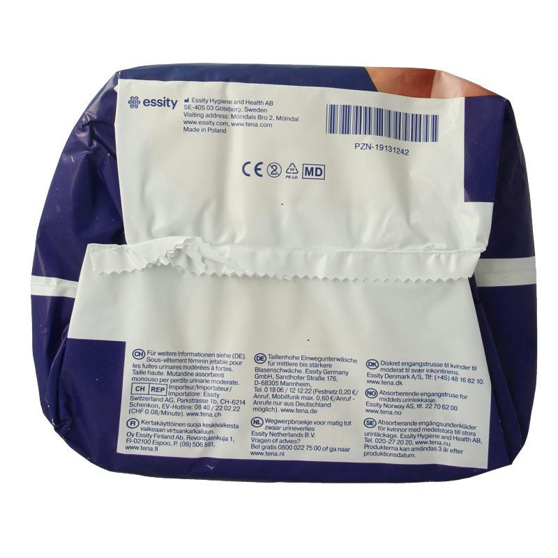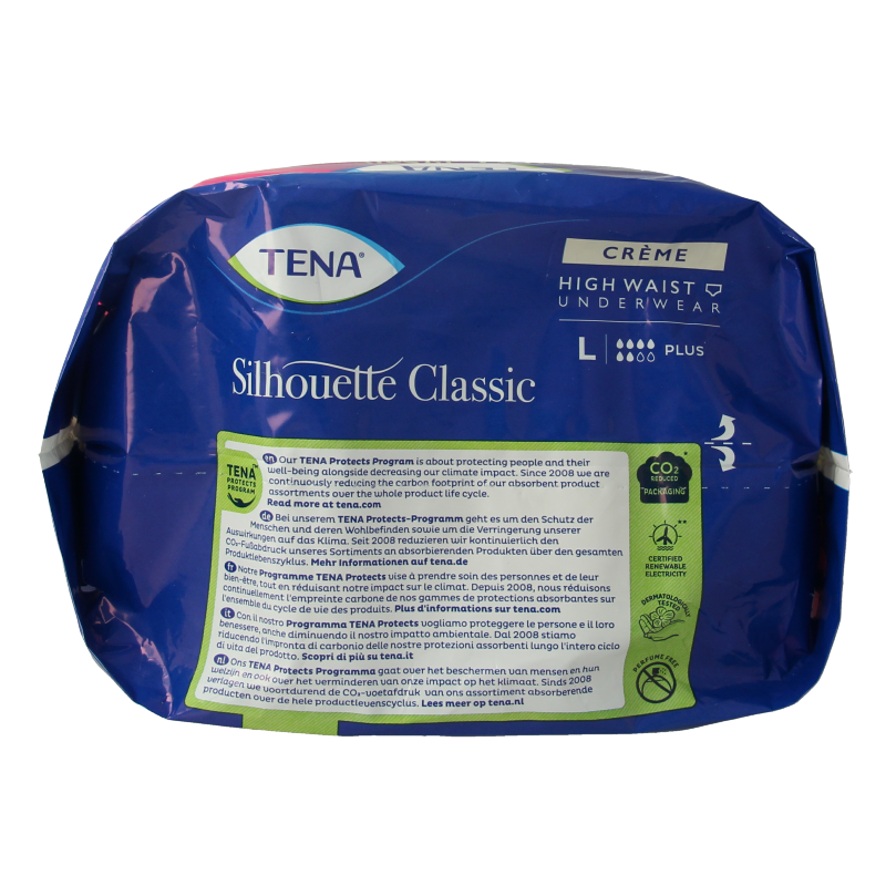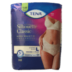 TENA Silhouette Plus High Waist Crème is incontinentieondergoed voor vrouwen. Het voelt aan als normaal ondergoed en is ontworpen voor matig tot zwaar urineverlies. Het ondergoed heeft zowel aan de binnen- als buitenkant een chique crèmekleur en is elegant discreet en stijlvol. Een hoge taille, vrouwelijk ontwerp en soft-fit stof zorgen ervoor dat het broekje op zijn plaats blijft zitten en uitstekende bescherming, draagcomfort en discretie biedt. De betrouwbare absorberende kern met Plus-niveau sluit zwaarder urineverlies nog sneller in en neutraliseert geuren voor een fris en vrouwelijk gevoel de hele dag door.