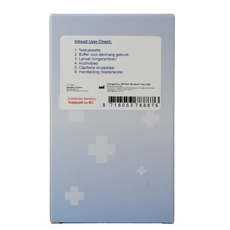 IJzer-Check® is een zelftest waarmee op een eenvoudige manier het ijzergehalte (ferritine) in het bloed kan worden bepaald. IJzer-Check® is een kwalitatieve zelftest waarmee kan worden getest of er sprake is van een ijzer deficiëntie of niet.