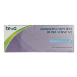 1 Zwangerschapteststrip in een aluminiumfolie zakje en een zakje met silicagelkorrels (om vocht op te nemen).