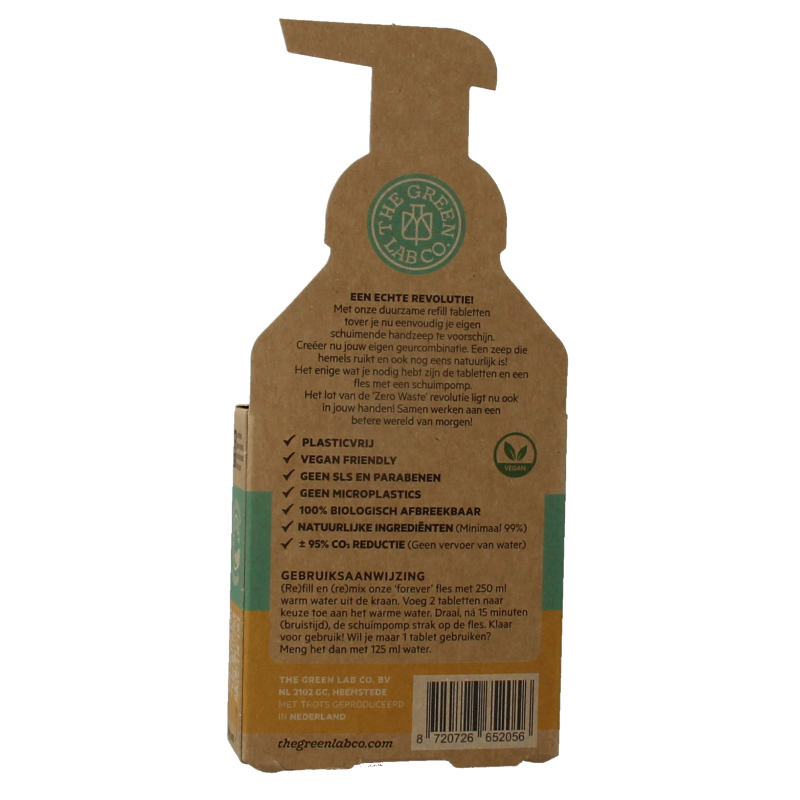 Vul onze ‘forever’ fles (of jouw eigen fles met schuimpomp) met 250 ml (warm) water uit de kraan. Voeg 2 tabletten naar keuze toe aan het warme water. Draai, ná 10 minuten (bruistijd / oplostijd), de schuimpomp strak op de fles. Ná 30 minuten wachten is je schuimende handzeep klaar voor gebruik! Wil je maar 1 tablet (één soort) gebruiken? Meng het dan met 125 ml warm water.