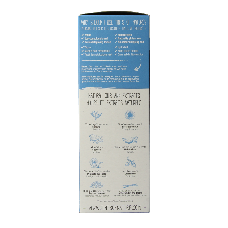 Tints of Nature is de eerste en enige lijn van langdurige permanente haarverf op de huidige markt die gecertificeerde organische ingrediënten bevat die geproduceerd zijn middels het gebruik van een geavanceerde formule met natuurlijke ingrediënten om al het grijze haar te dekken. Onze unieke mix van natuurlijke extracten en Vitamine E & C, gecombineerd met van planten afkomstige conditioners zullen daadwerkelijk het haar versterken, beschermen en bevochtigen terwijl u uw haar kleurt.