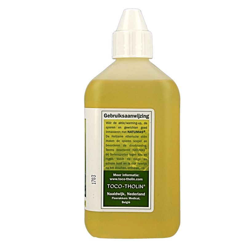 De etherische oliën, gewonnen uit heilzame planten en kruiden houden het lichaam soepel. Ze worden snel opgenomen in de spieren en bevorderen daar de doorbloeding. Tevens beschermd NATUMAS bij buitensporten tegen kou en regen, voedt de droge en schrale huid en is heerlijk na het douchen, ontharen etc.