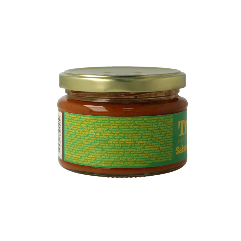 Uien*, Water, Tomatenconcentraat*, Tomaat* (9,7%), Paprika*, Appelconcentraat*, Azijn*, Maiszetmeel*, Zonnebloemolie*, Zeezout, Bouillonpoeder* (Zout, Dextrose*, Aardappelzetmeel*, Gistextract*, Zonnebloemolie*, Preipoeder*, Uienpoeder*, Curcuma*, Thijm*, Witte peper*, Laurier*, Nootmuskaat*, kruidnagel*), SELDERIJblad* (0,08%), Paprikapoeder*, Korianderblad*, Knoflookpoeder*, Xanthaangom*