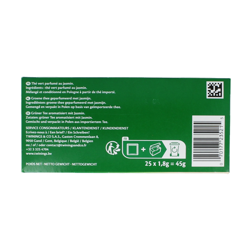 Groene thee jasmijnTwinings Groene thee jasmijn IngrediëntenGroene thee geparfumeerd met jasmijn. BewarenKoel en droog bewaren. Fabrikant / DistributeurTwinings & Co S.A.S., Gaston Crommenlaan 8, 9050 Gent, België Land van herkomstPolen