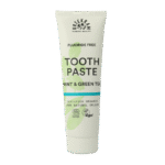 De verfrissende smaak van munt gecombineerd met een dosis groene thee. Het schijnt dat de polyfenolen in groene thee een positief effect hebben op onze tanden en het tandvlees. Onderzoekers van de universiteit van Illinois in de Verenigde Staten zijn na uitgebreid onderzoek tot deze conclusie gekomen. Verder is deze tandpasta een pure natuurlijke krachtpatser. Het gebuikte kalk is miljoenen jaren geleden ontstaan en wordt gewonnen op de zeebodem om vervolgens voor verdere verwerking te worden verpulverd. Dat is ook de reden waarom deze tandpasta de kenmerkende lichtgrijze kleur van natuurlijk kalk heeft. Verder bevat deze tandpasta een flinke dosis aloë vera, wat het tandvlees helpt beschermen en verzorgt. En als extraatje is er een beetje mirre toegevoegd, dat bekend staat om zijn desinfecterende werking.