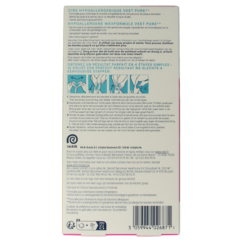 Lees voor het gebruik van Veet-waxstrips zorgvuldig de voorzorgsmaatregelen op de verpakking. Zorg ervoor dat de huid voor de waxbeurt volledig schoon en droog is. U kunt de waxstrips meer dan één keer per ontharingssessie hergebruiken tot ze niet meer kleven. Niet meer nodig om de strips tegen elkaar te wrijven om ze uit elkaar te halen! U krijgt een geweldig resultaat na slechts 4 eenvoudige stappen:
