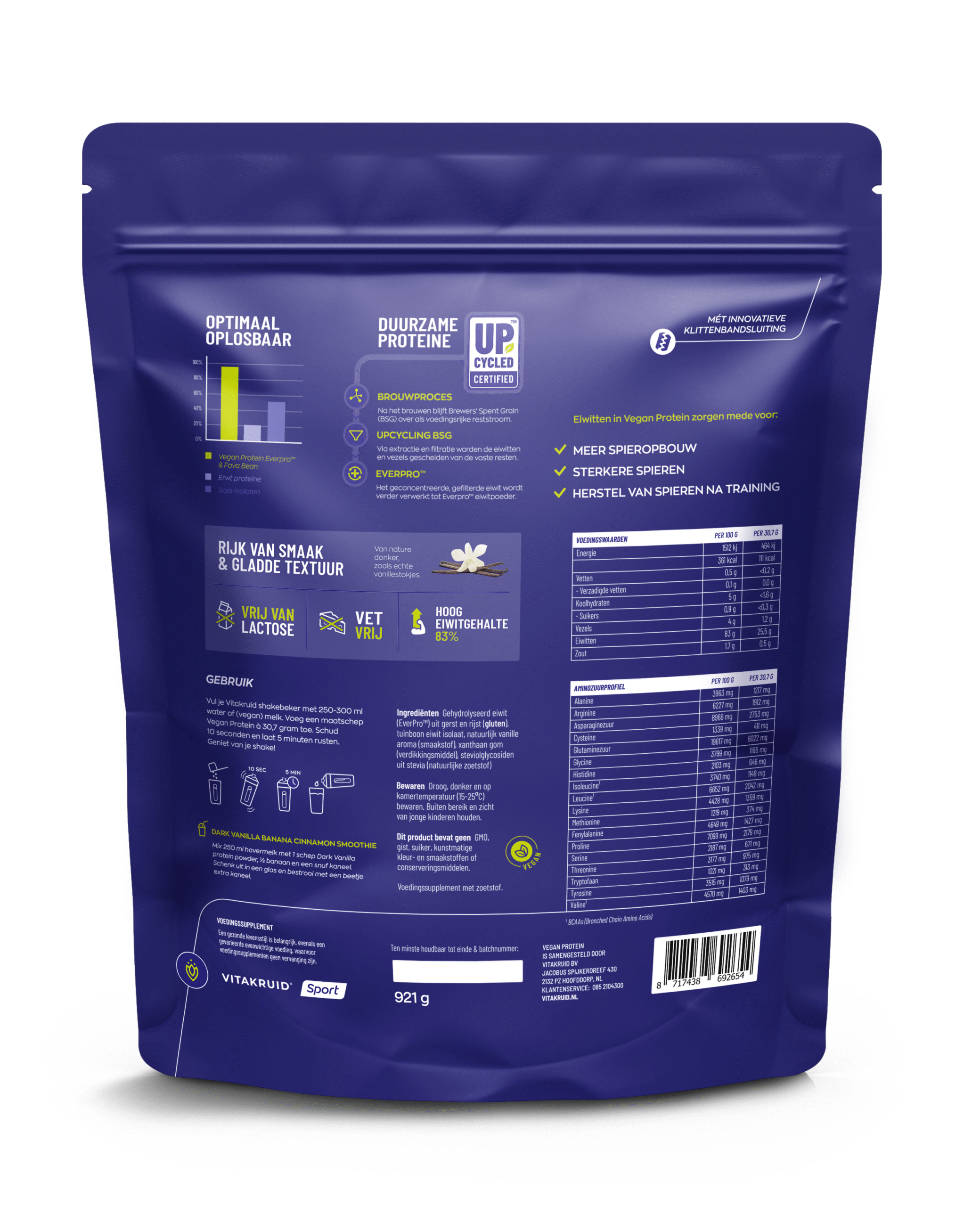 Vergeleken met een standaard whey-product levert Vegan Protein een gelijke hoeveelheid eiwitten per portie, maar dan met de voordelen van een volledig plantaardige oorsprong en een duurzamere productie. Daarmee biedt het een hoogwaardig alternatief dat past binnen de huidige vraag naar gezonde en verantwoorde eiwitbronnen.