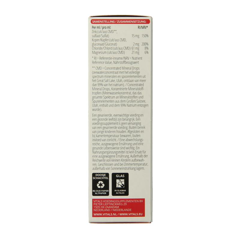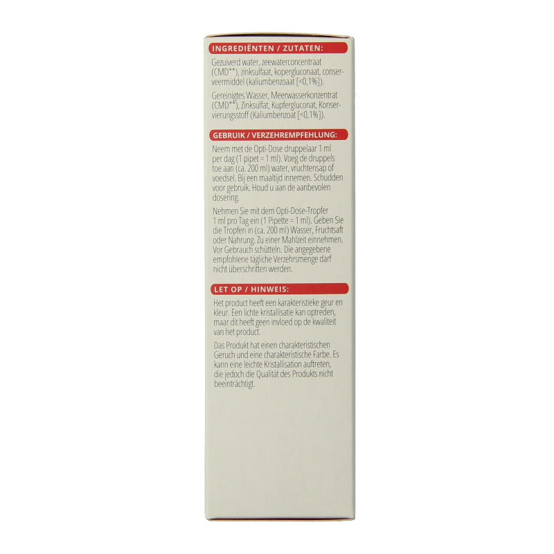 Elementair Zink & Koper bevat als basis ‘concentrated mineral drops’ (CMD), een speciaal zeewaterconcentraat uit het Great Salt Lake (Utah, USA) met het volledige spectrum mineralen en spoorelementen (ontdaan van bijna alle natrium, en in dit geval aangevuld met extra zink in de vorm van zinksulfaat en extra koper als kopergluconaat). Dit product wordt vervaardigd door middel van een traditioneel en natuurlijk concentratieproces met gebruik van de zon.