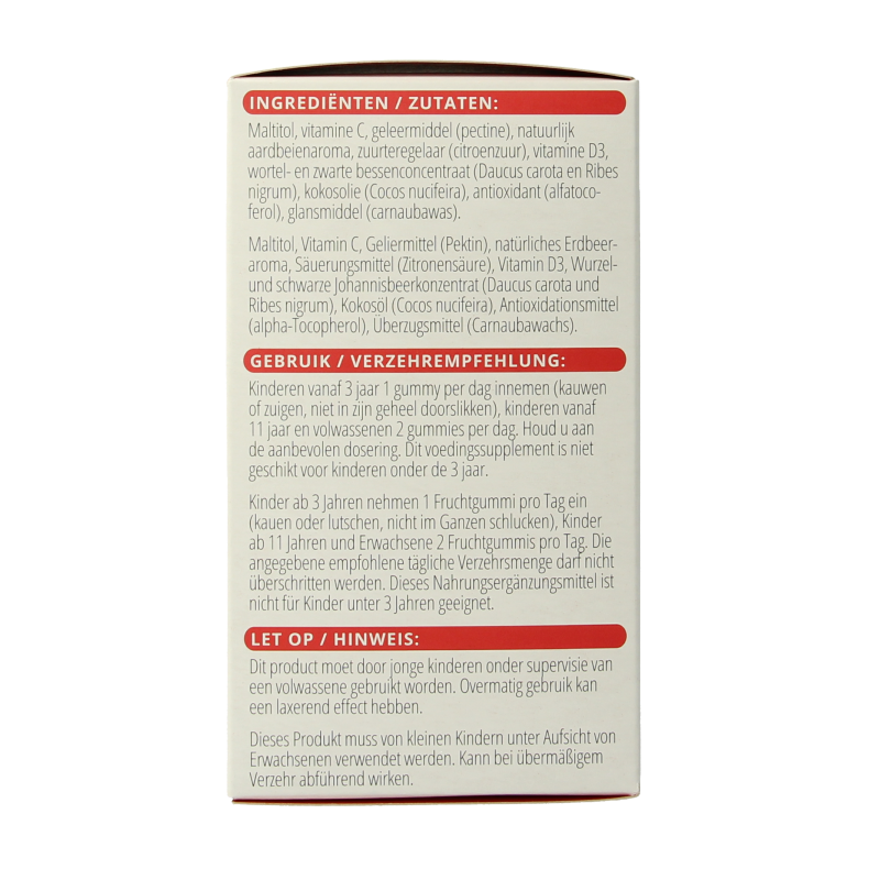 Niet iedereen vindt het even prettig of makkelijk om een voedingssupplement in te nemen. Voor die mensen heeft Vitals nu de ideale oplossing. Een gecombineerd vitamine C- en vitamine D3-supplement in de vorm van een heerlijke gummy met bosvruchtensmaak. Zónder toegevoegde suikers! Dit product in de vorm van een beertje is bij uitstek geschikt voor kinderen met hun vaak veeleisende smaakpapillen. Op deze manier krijgen ze toch hun dagelijkse dosis vitamine D binnen en extra vitamine C ter ondersteuning van het immuunsysteem. Maar ook jongeren, volwassenen of ouderen die moeilijk kunnen slikken of gewoon liever een lekkere gummy nemen, kunnen heel goed gebruikmaken van dit product.