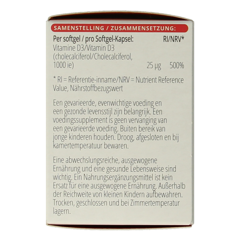 | Vitamine D3 (cholecalciferol, 1000 ie) | 25 µg | 500% |