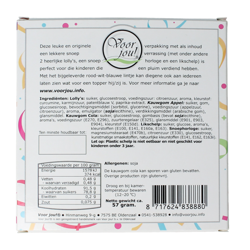 Snoephoorloge: suiker, magnesiumstearaat (E470b), citroenzuur (E330), glucosestroop, kunstmatige smaakstoffen, natuurlijke kleurstoffen (E141, E162, E163ii).