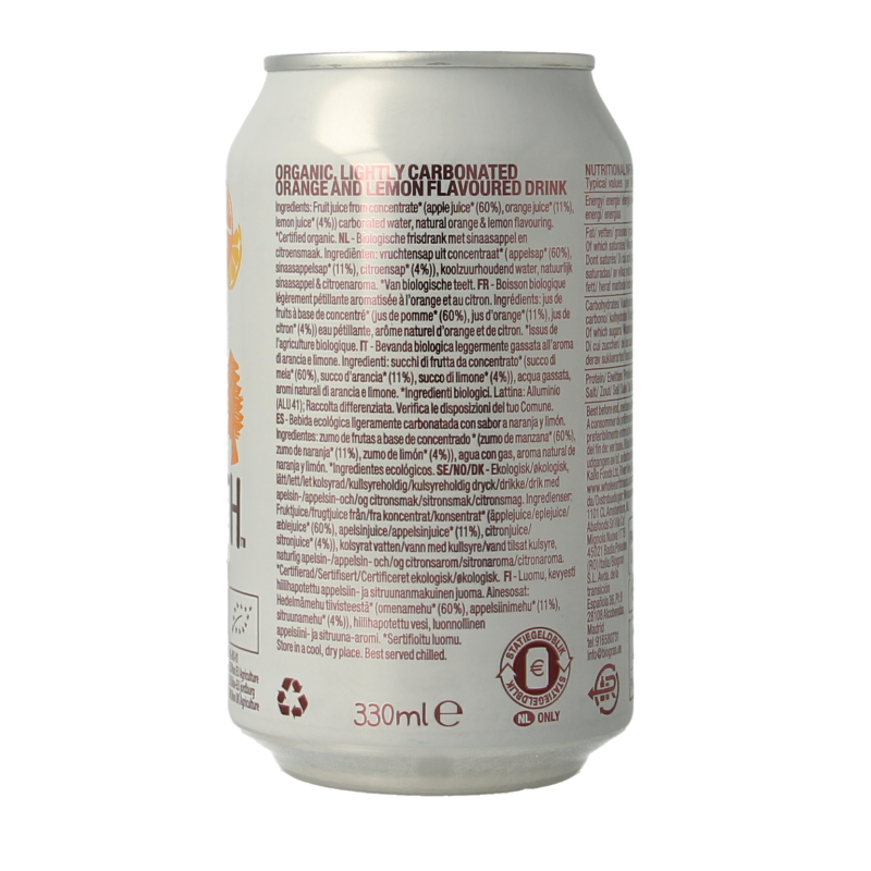 Vruchtensap uit concentraat* (appelsap* (60%), sinaasappelsap* (11%)), citroensap (4%)m koolzuurhoudend water, natuurlijk sinaasappel en citroenaroma