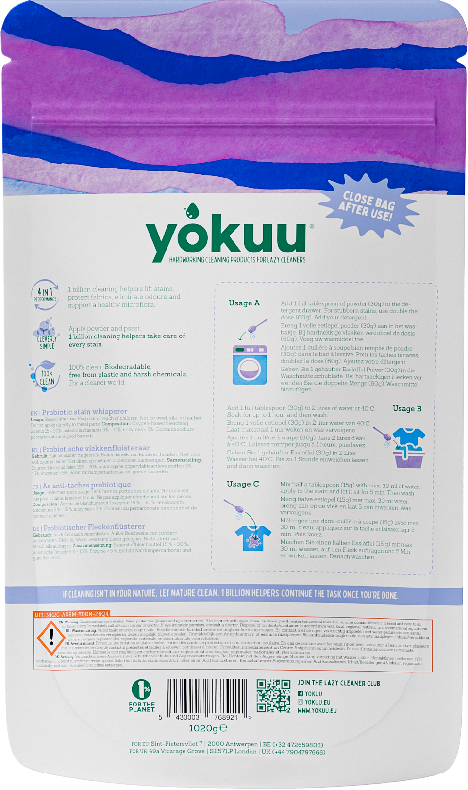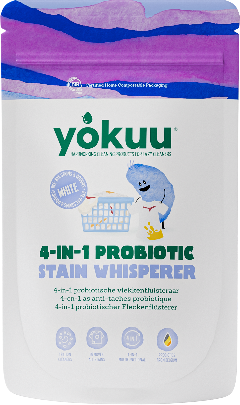 De Vlekkenfluisteraar van YOKUU gebruikt een slimme mix van enzymen en 1 miljard microscopische poetshulpjes – ook wel probiotica genoemd – om zichtbare vlekken en hardnekkige geurtjes te verwijderen. Hij werkt al op lage temperaturen, en blijft zelfs schoonmaken nadat de wasmachine stopt. Zo bouwt hij een gezonde microflora op, in je wasmachine én op je kleren.