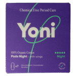 Yoni heeft voor biologisch katoen gekozen omdat het ademend en hypo-allergeen is. De achterkant van ons maandverband en de individuele verpakking zijn gemaakt van bioplastic verkregen uit maïszetmeel. Daarmee is het hele product biologisch afbreekbaar.