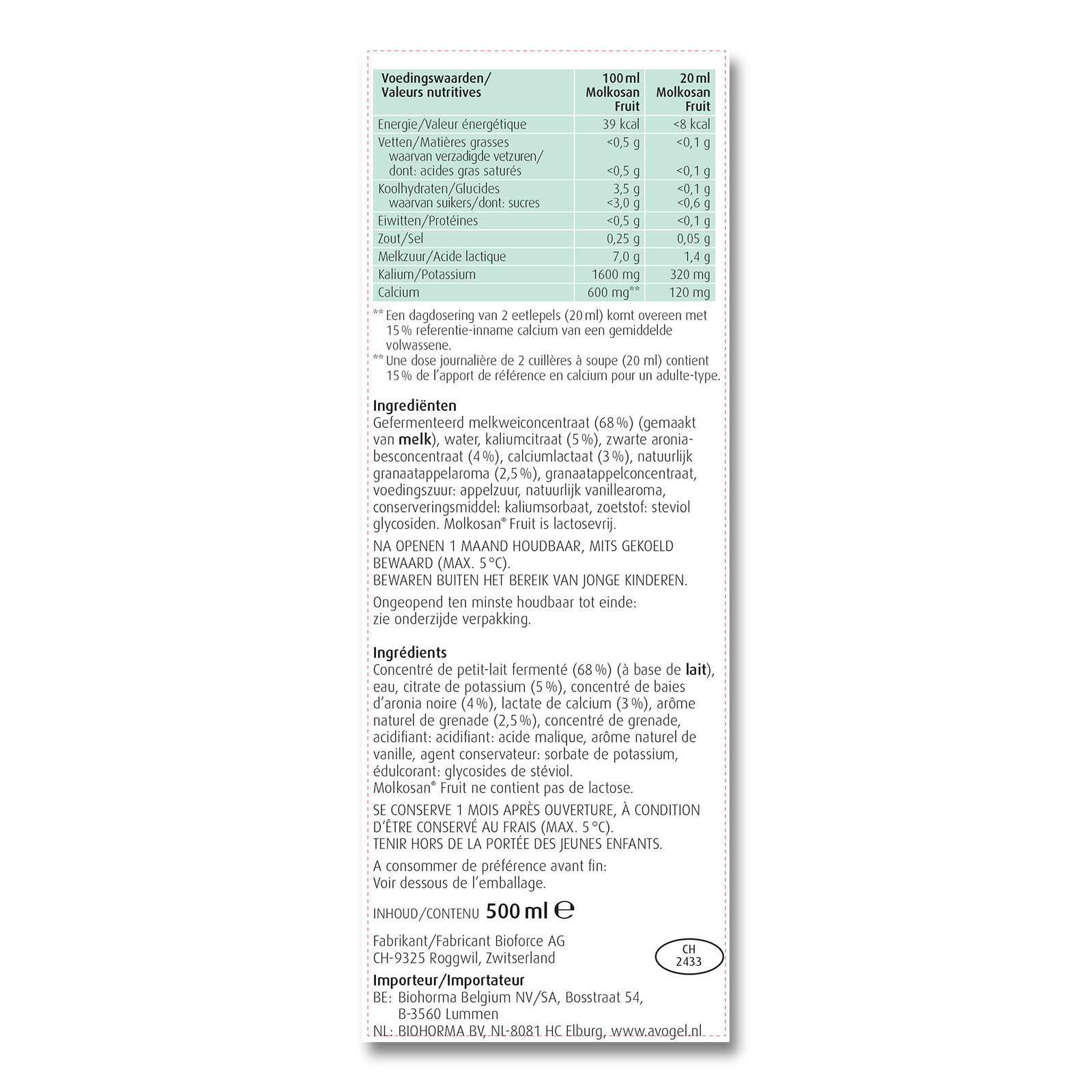 Gefermenteerd MELKweiconcentraat (67,94%) (gemaakt van MELK); water; kaliumcitraat (4,83%); zwarte aroniabesconcentraat (4,16%); calciumlactaat (3,03%); natuurlijk granaatappelaroma (2,37%); granaatappelconcentraat (1,78%); voedingszuur: appelzuur, natuurlijk vanillearoma (0,69%); conserveringsmiddel: kaliumsorbaat; zoetstof: steviolglycosiden.