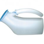 Deze melkwitte urinefles met blauwe dop heeft een handig handvat.