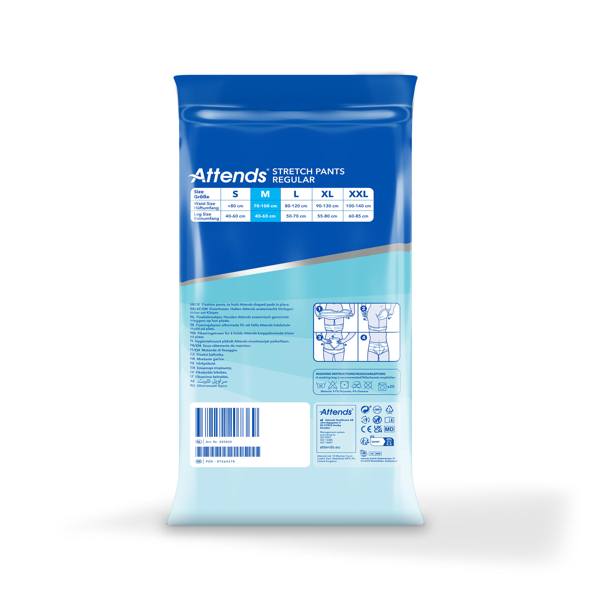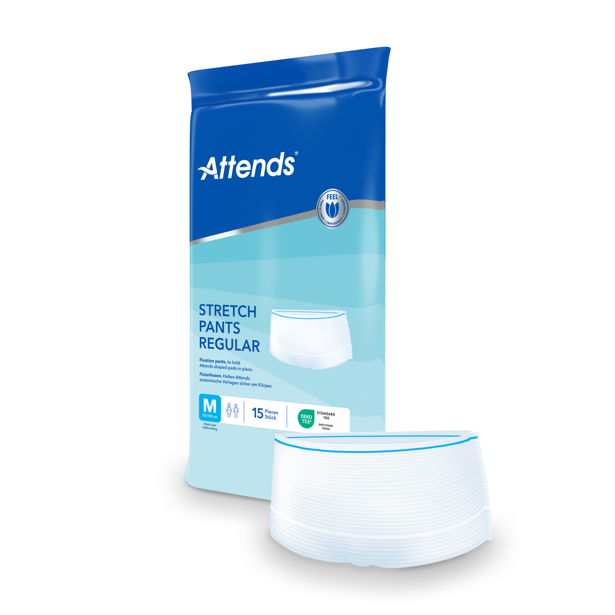 Attends Stretch Pants zijn herbruikbare en wasbare fixatiebroekjes met korte pijpjes. Ze houden Attends inleggers stevig op hun plaats voor een betrouwbare bescherming tegen lekkage. De broekjes zijn gemaakt van zacht, elastisch en ademend materiaal en bieden een goede, nauwsluitende pasvorm en comfort. Het naadloze ontwerp zorgt voor een discrete en veilige fixatie en voorkomt drukpunten op de huid. Verkrijgbaar in maat S – XXL. Voor een optimale bescherming is het belangrijk om de juiste maat fixatiebroekje te kiezen. Meet de omvang van de heup en taille en kies de grootste omtrek om de juiste maat te bepalen.