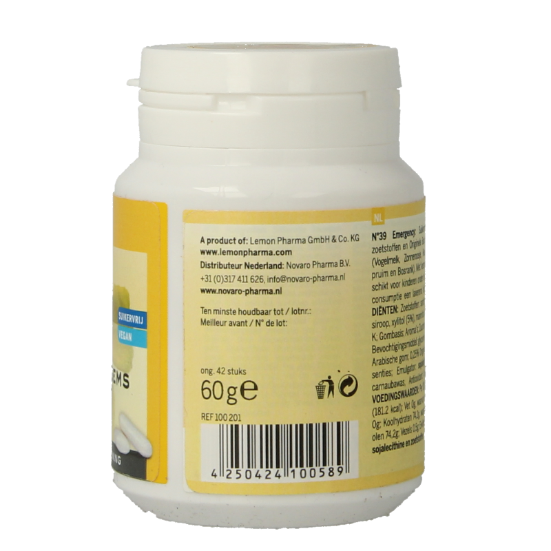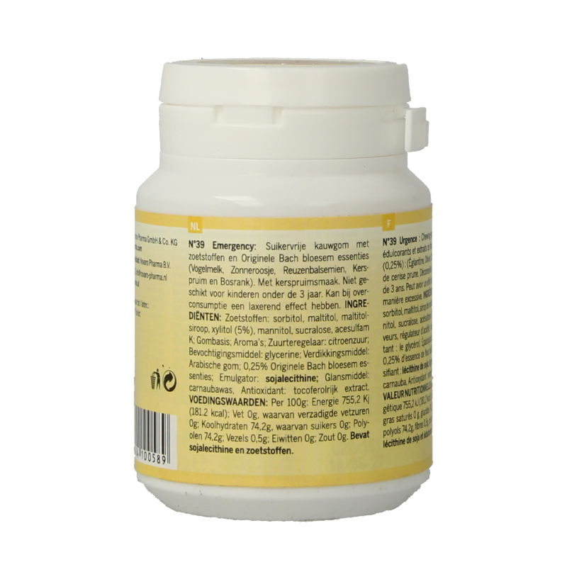 Zoetstoffen: sorbitol, manitol, maltitolsiroop, xylitol (5%), mannitol, sucralose, acesulfaam K, Gombasis: aroma”s: zuurteregelaar, citroenzuur, Bevochtigingsmiddel: glycerin, Verdikkingsmiddel: arabische gom, 0,25% Originele Bach bloesem essenties, Emulgator: SOJA lecithine, Glansmiddel: carnaubawas, Antioxidant: tocoferolrijk extract