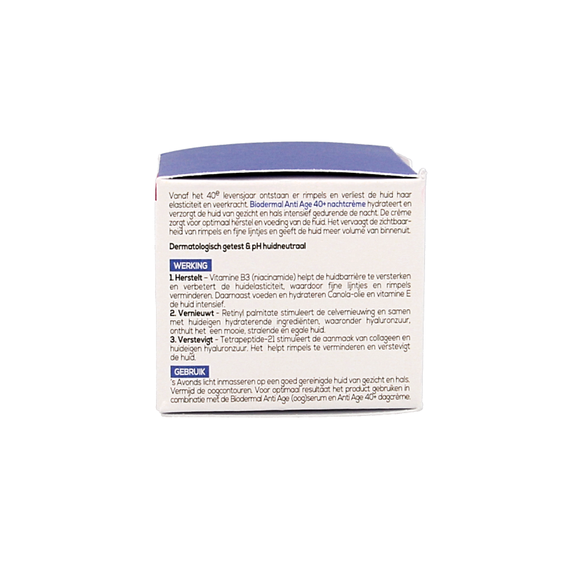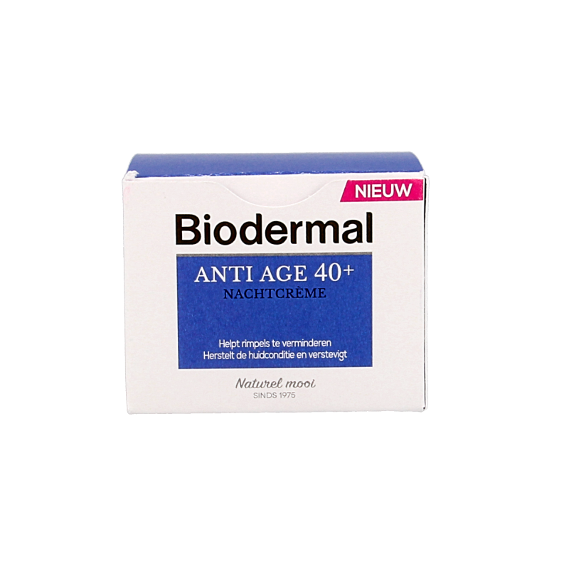 Rond het 40e levensjaar verliest de huid haar elasticiteit en veerkracht en ontstaan er rimpels. Anti Age 40+ nachtcrème van Biodermal verzorgt en hydrateert de gezichtshuid en hals intensief gedurende de nacht. De Anti Age crème zorgt voor voeding en optimaal herstel van de huid. Het vervaagt fijne lijntjes, de zichtbaarheid van rimpels en geeft de huid van binnenuit meer volume.