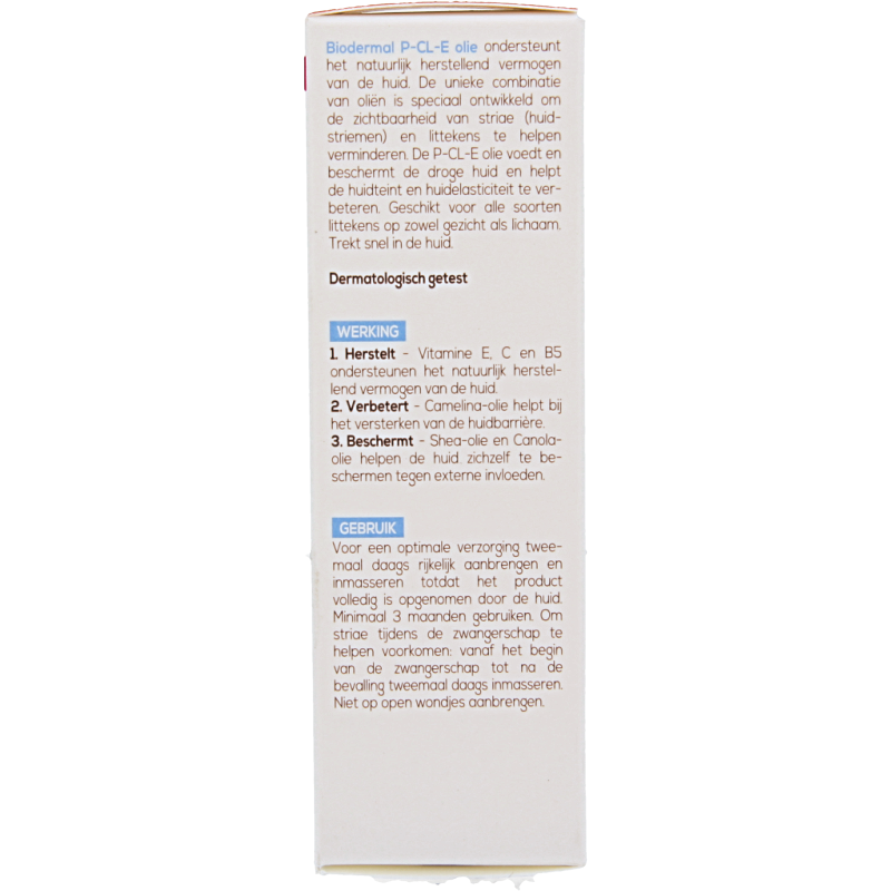 Breng de Biodermal P-CL-E olie voor een optimale verzorging tweemaal daags rijkelijk aan en masseer in totdat het product volledig is opgenomen door de huid. Gebruik de P-CL-E olie voor minimaal 3 maanden om zichtbaar resultaat te bereiken. Wil je striae tijdens de zwangerschap helpen voorkomen? Masseer de olie dan vanaf het begin van de zwangerschap tot na de bevalling tweemaal daags in. Niet op open wondjes aanbrengen.