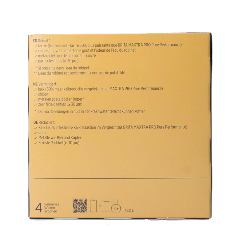 De BRITA MAXTRA PRO KALK EXPERT waterfilters voor een optimale bescherming van apparaten: verminderen kalk tot +50% effectiever dan BRITA ALL-IN-1 filterpatronen – ideaal voor gebieden met hard tot zeer hard water. Filteren dankzij de innovatieve 4-staps filtratie op basis van natuurlijke actieve kool van kokosnootschalen & ionenwisselaarparels kalk, smaakverstorende stoffen, onzuiverheden van bepaalde herbiciden, pesticiden & medicijnen en metalen als lood en koper die via de leidingen in je huis in je drinkwater terecht kunnen komen. Vertrouw op het origineel: BRITA gefilterd kraanwater smaakt niet alleen bijzonder puur & fris, maar biedt ook een extra betrouwbare bescherming tegen kalkaanslag van huishoudelijke apparaten. Het is een duurzaam alternatief voor flessenwater en heel gemakkelijk in gebruik. Ontdek het volle aroma: BRITA zorgt voor fris gefilterd water en geeft je ook beter smakende koude en warme dranken met een voller aroma. BRITA MAXTRA PRO waterfilters verminderen ook effectief kalkaanslag en zorgen voor een langere levensduur van je waterkoker en koffiemachine. 1 MAXTRA PRO KALK EXPERT filterpatroon is goed voor 4 weken of 150 liter gefilterd kraanwater. Door ze tijdig te vervangen geniet je altijd van heerlijk BRITA gefilterd water. Bevat 6 MAXTRA PRO KALK EXPERT filterpatronen goed voor 6 maanden gefilterd water.