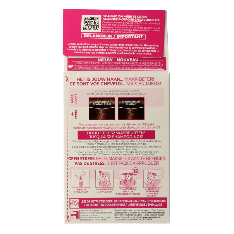 Casting Crème Gloss bevat geen ammoniak waardoor het zacht is voor je haar. De kleur houdt tot 28 wasbeurten, dus je kunt weer gemakkelijk van haarkleur veranderen. Perfect voor iedereen die de stap naar een permanente haarkleuring te groot vindt!
