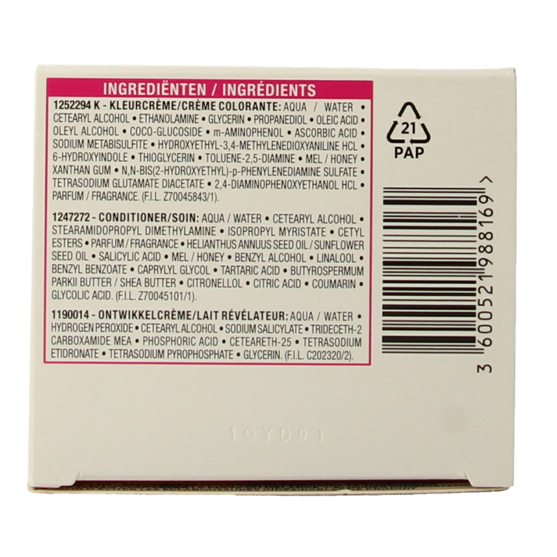 Aqua / Water, Cetearyl Alcohol, Ethanolamine, Glycerin, Propanediol, Oleic Acid, Oleyl Alcohol, Coco-Glucoside, M-Aminophenol, Ascorbic Acid, Sodium Metabisulfite, Hydroxyethyl-3,4-Methylenedioxyaniline HCL, 6-Hydroxyindole, Thioglycerin, Toluene-2,5-Diamine, Mel / Honey, Xanthan Gum, N,N-Bis(2-Hydroxyethyl)-P-Phenylenediamine Sulfate, Tetrasodium Glutamate Diacetate, 2,4-Diaminophenoxyethanol HCL, Parfum / Fragrance. (F.I.L. Z70045843/1).