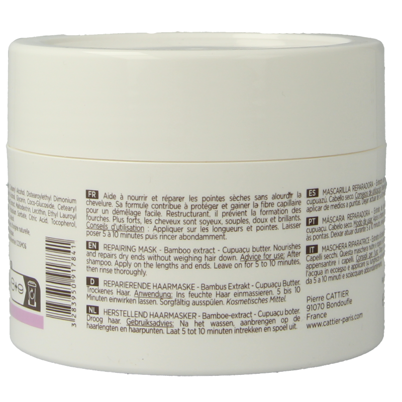Het biologische, herstellende masker van Cattier heeft een rijke, zachte textuur die droge punten voedt en herstelt zonder het haar zwaar te maken. De met cupuaçuboter en bamboemerg verrijkte formule herstelt en omhult de haarvezels en maakt het haar gemakkelijk doorkambaar. Het masker herstelt de haarstructuur en voorkomt gespleten punten. Het haar wordt sterker, voelt zijdezacht en soepel aan en ziet er glanzend uit.