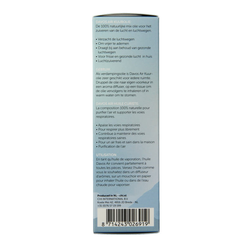 Davos staat voor luchtzuivering, gezonde luchtwegen en meer lucht! Davos kuurolie is een natuurlijke luchtverfrisser die niet alleen heerlijk ruikt, maar de lucht ook daadwerkelijk zuivert. Daarnaast geeft de olie letterlijk meer lucht. Een heerlijke olie bij koude dus.