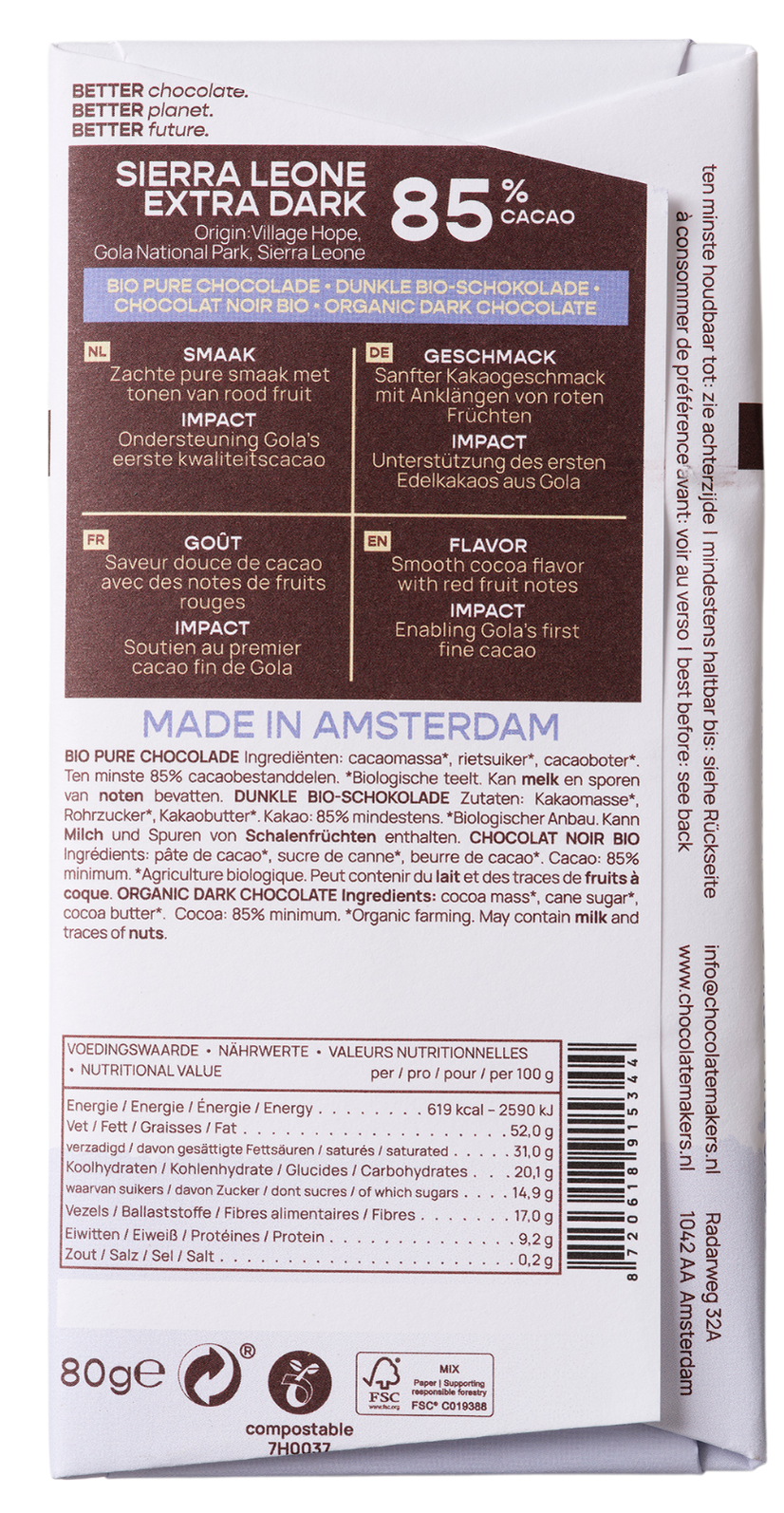 In Sierra Leone werken wij samen met Village Hope. Village Hope werkt aan het terugdringen van armoede in de landelijke gebieden van Sierra Leone doormiddel van het creëren van opgeleide boeren die biologische producten van hoge kwaliteit aanbouwen en daarmee een vast inkomen verdienen. Samen hebben wij de productie van de eerste superieure kwaliteitscacao uit de regio opgezet. Een regio die tot nu toe bekend stond om lage kwaliteit cacao.