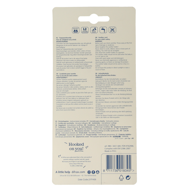 Dit fopspeenkoordje mag alleen bevestigd worden aan kleding. Gebruik dit product niet in de wieg of het bedje. Dit product niet gebruiken als speelgoed of bijtspeeltje.