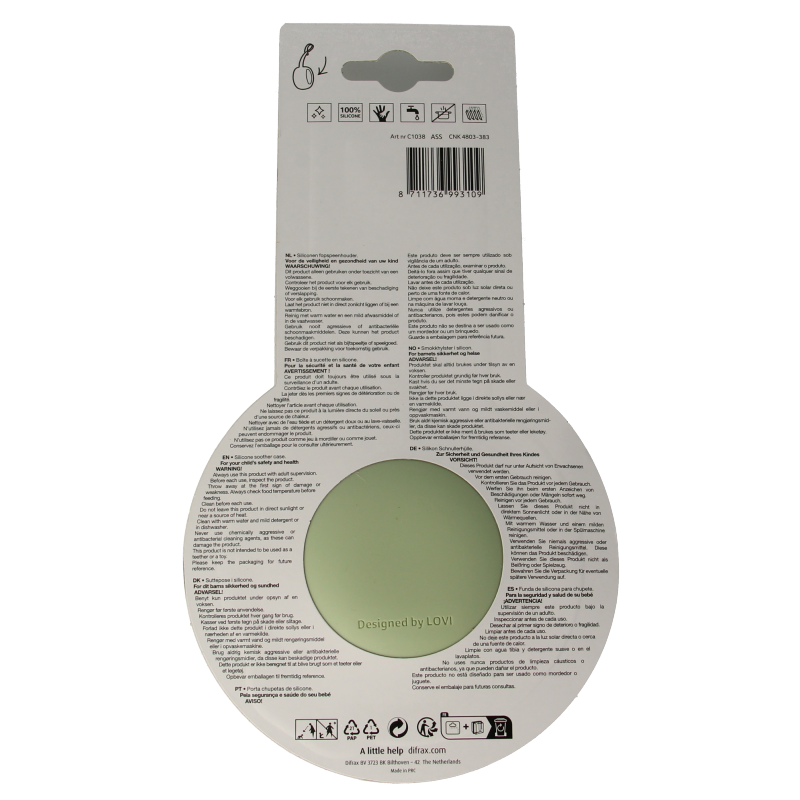De trendy Difrax LOVI fopspeenhouders zijn onmisbaar voor in en rondom het huis. Geen verdwaalde fopspenen meer die op de grond vallen of vies worden. Met de flexibele lus hang je de houder eenvoudig aan de (luier)tas, kinderwagen, autostoel, draagzak of box. Zo heb je altijd een set schone fopspenen bij de hand. Het siliconenmateriaal voelt extra zacht aan en is veilig in gebruik.